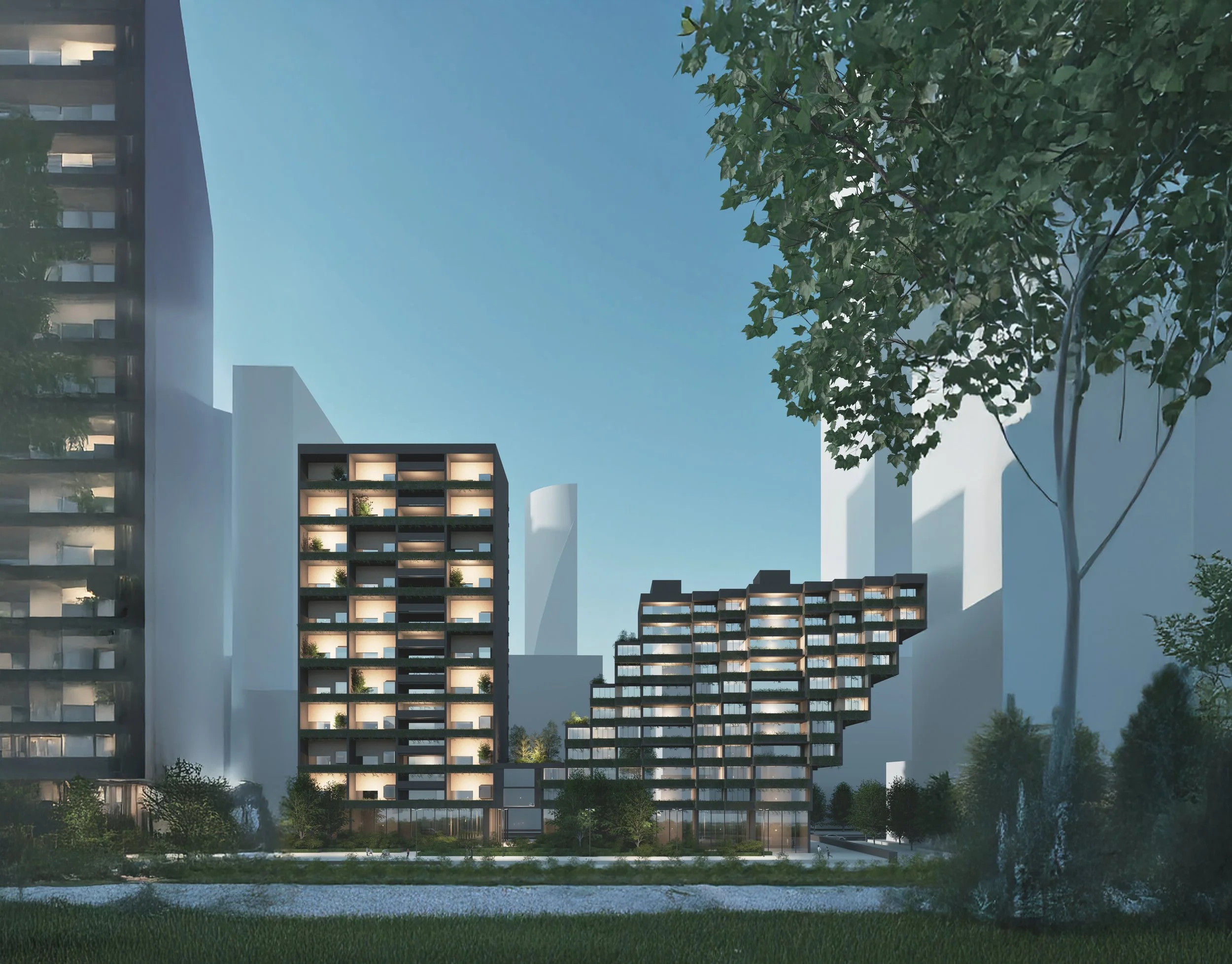 The ground floors include commercial and communal areas, connecting the residences with their urban surroundings. The design emphasizes sustainability, safety, and accessibility, offering diverse housing types suited to different user profiles.